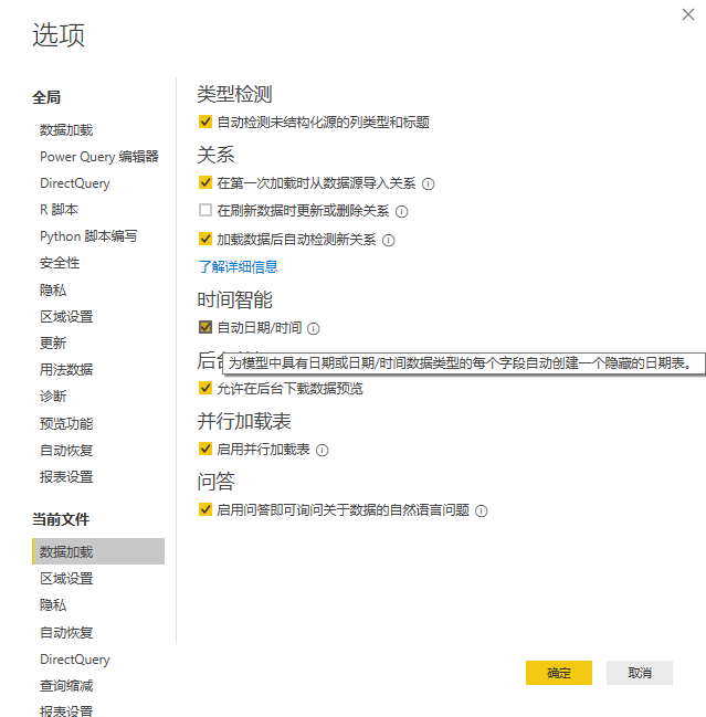 日期表作为时间智能函数的基础表,PowerBI可以自动未具有日期或日期时间类型的字段自动创建一个隐藏的日期表。动手操作PowerBI的小伙伴们应该都已经发现了这个功能。软件自带的日期表开启方式如下图:(打开路径:文件=》选项和设置=》选项=》数据加载,默认已勾选自动日期/时间)