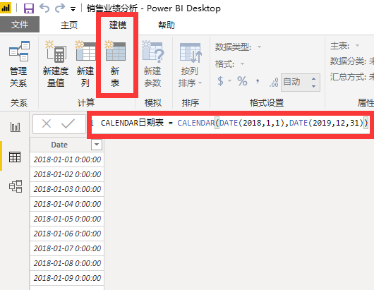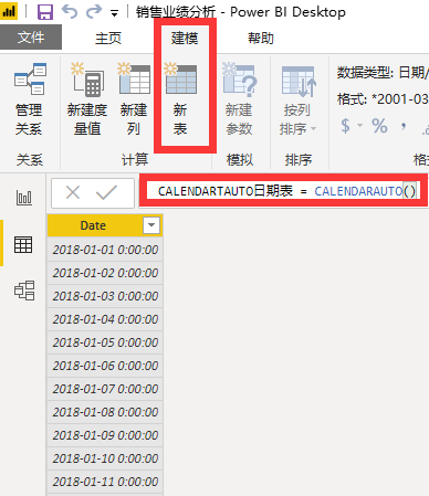 CALENDARTAUTO函数主要依托数据源中的日期范围,选择建模选项卡新建一个空白表,输入公式:CALENDARTAUTO日期表=CALENDARTAUTO()。在PowerBI中会自动识别业务数据中涉及的日期范围生成日期表。在本文中业务数据的日期范围从2018-1-1到2019-12-31的所有日期。当然我们还需要添加日期列,如年份,月份等。操作和Excel中操作方式相同,用Year函数创建年份,用Month函数创建月份即可,这里就不做展现了大家可以看销售目标中的公式参考。创建完成后将该表标记为日期表。