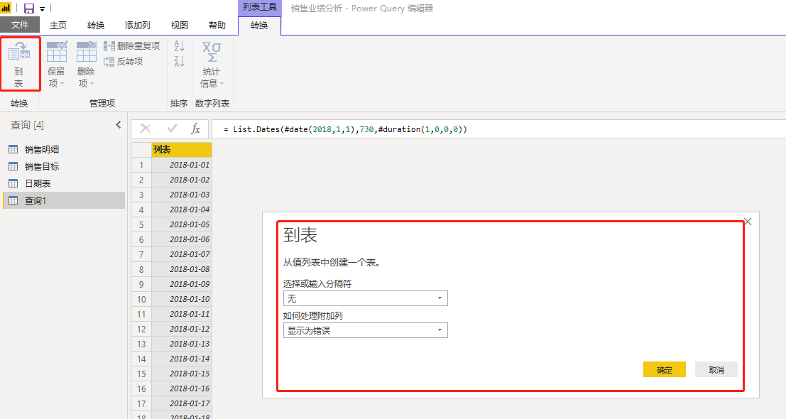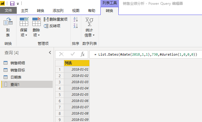 3.2使用List.Dates函数构建日期列表,该函数有三个参数分别是:起始日期,日期天数,日期间隔