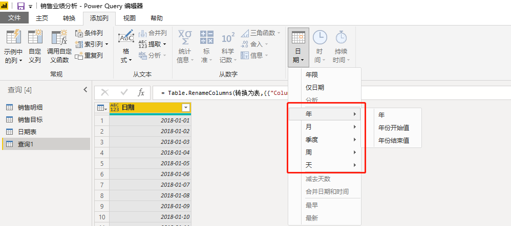切换到添加列选项卡,点击日期,提取年份,季度,月份