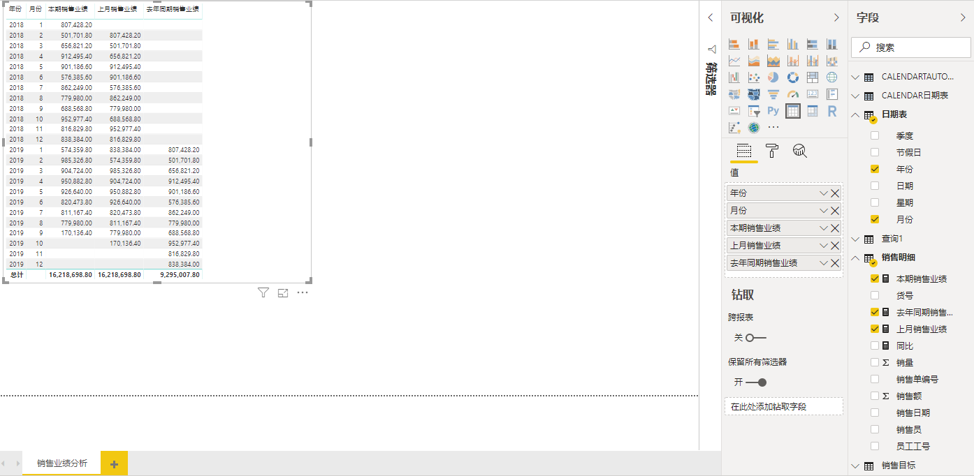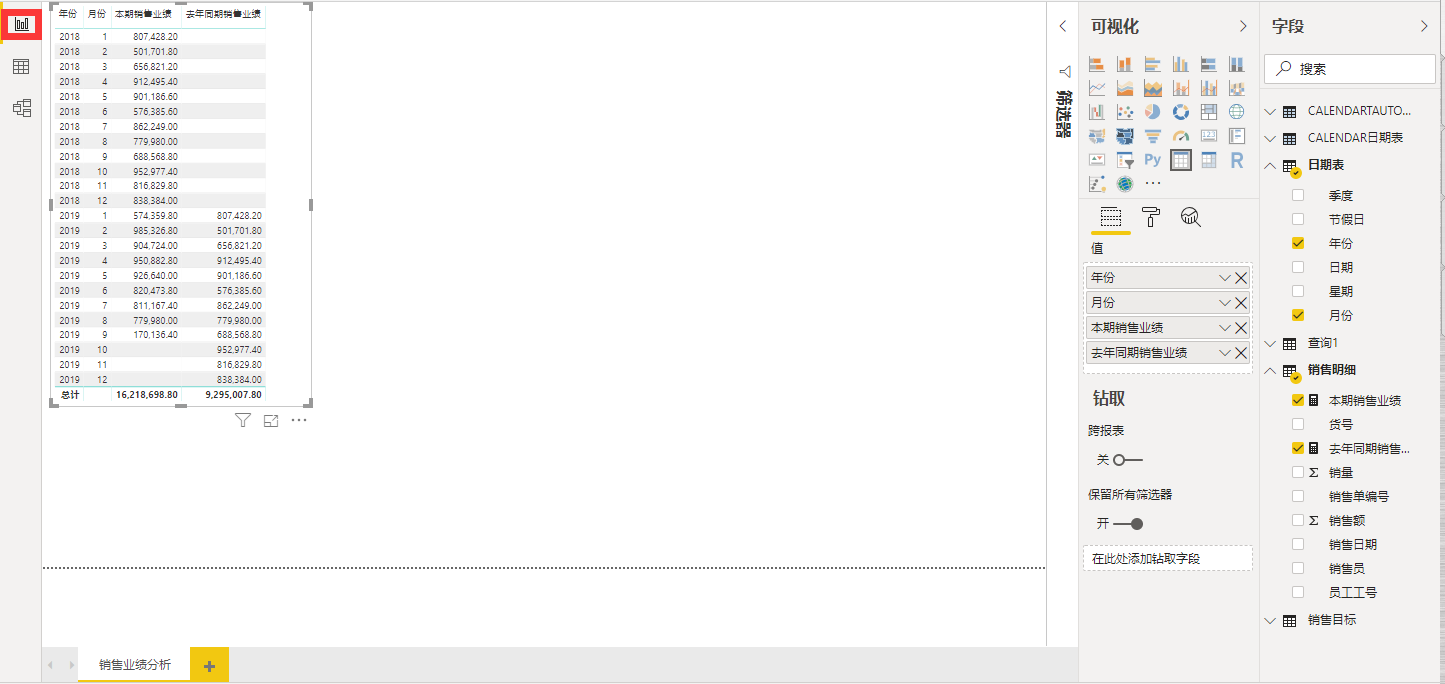 在可视化面板中拖放日期表中年,月字段和销售明细表中的本期销售业绩和去年同期的销售业绩,来展现效果查看验证度量值是否取数准确。