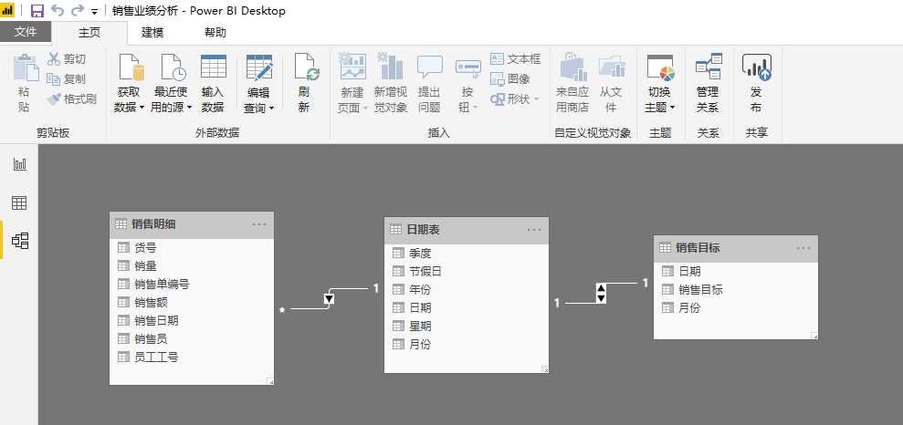 日期表建立完成后,建立日期表与其他数据之间的关系,即可使用时间智能函数计算同比,环比,累计等度量值。孤立的数据没有意义,只有在对比才能知道指标的高低。所以同比、环比查看时间维度的对比关系就显得比较重要。在建立指标之前,我们先通过销售数据和销售明细,日期表建立表和表之间的关联关系。如下图: