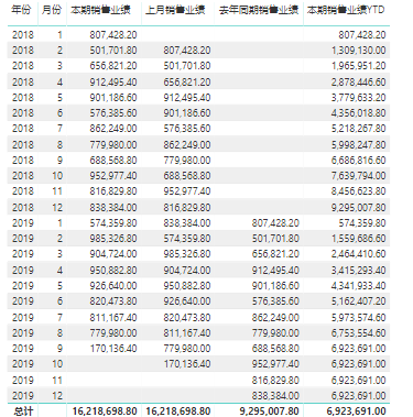 在图表中我们可以看到到2019年,2018年的数据就已经停止累加了。开始累加2019年的数据。前面我们也提到过按月进行计算同比数据有时候我们需要查看累计同比数据,举个例子:业务部门需要将1-6月半年的数据和去年的1-6月累计数据进行对比分析,这个时候我们只需要将销售相关度量值替换为累计销售额。