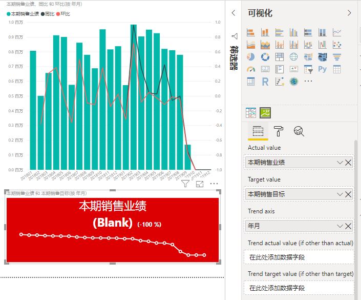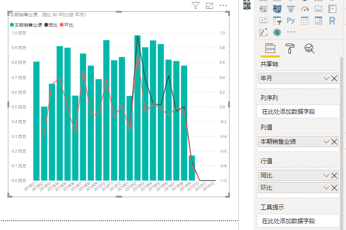 销售业绩变化情况图表主要使用PowerBI的折线和族状柱形图,在共享轴中设置年月,列值中放置本期销售业绩,行值设置同比和环比