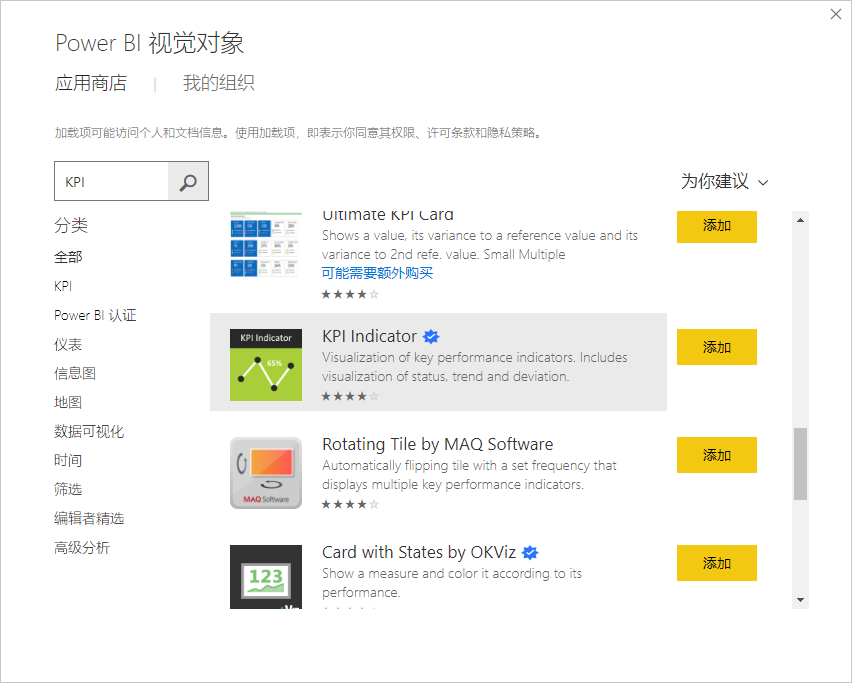 我们要处理的是KPI指标,在搜索框中输入KPI。这里添加KPI Indicator图表控件,大家可以业务场景选择不同的业务指标。注意:商店中有些控件会显示需要额外购买,该类型控件属于收费控件
