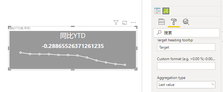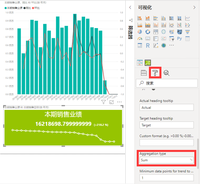 设置格式需要注意,同比比率是不可累加指标。所以这里需要设置聚合类型为区去最后的值。设置完成后再根据年月进行排序。