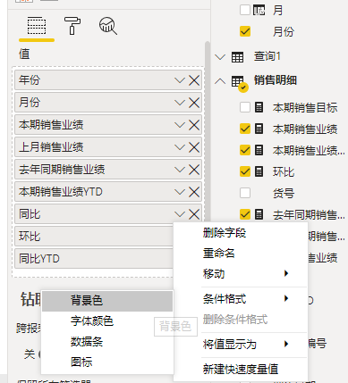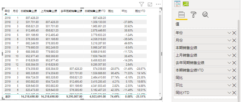 PowerBI对表格的操作非常灵活,这里我们就已同比环比为例,首先拖放相应字段到表格