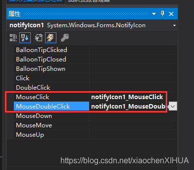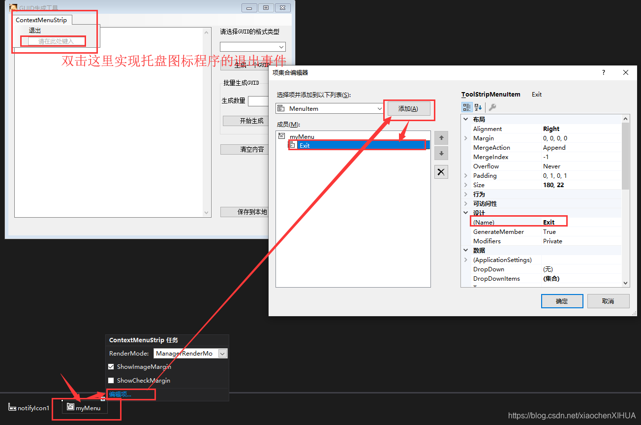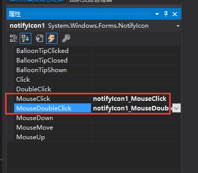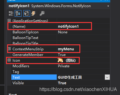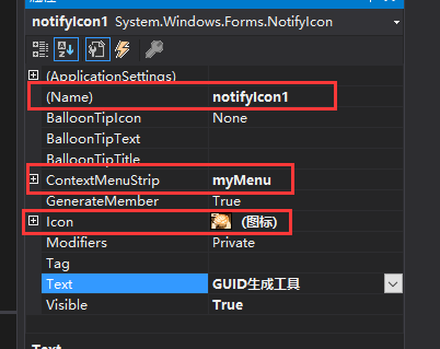 ③具体的实现脚本如下:(注意:notifyIcon1是NotifyIcon的名称,myMenu是ContextMenuStrip的名称)