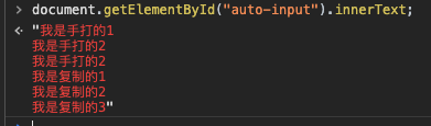 - 结果分析: 在输入到下一行的时候,第一个导致换行的字符在触发input事件的时候获取到的