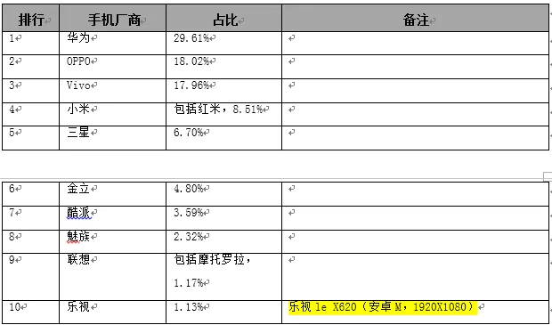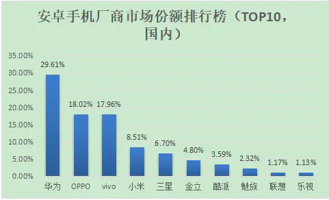 2018年4月安卓手机厂商市场份额排行榜(TOP10,国内)(来自百度移动统计)