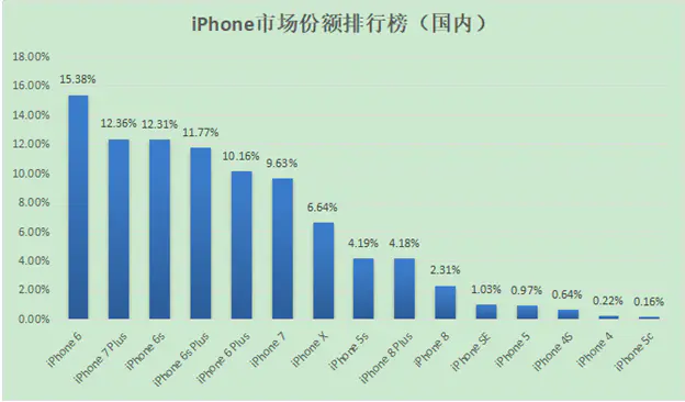 2018年4月,各款iPhone市场份额排行榜(国内)(来自百度移动统计)