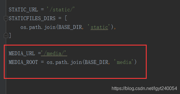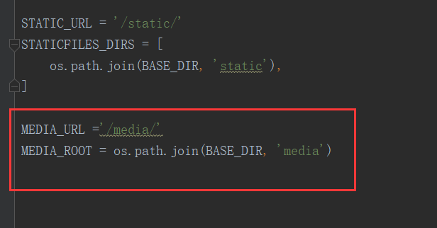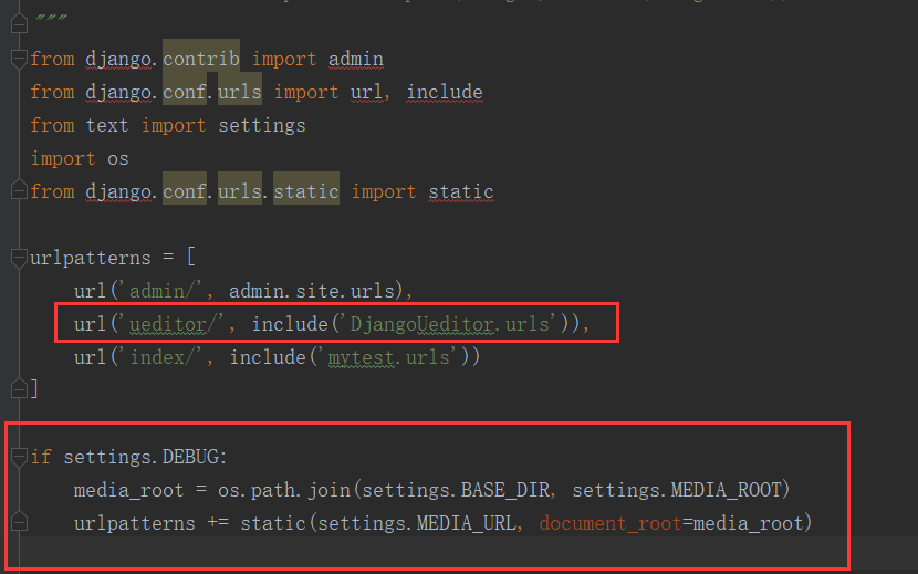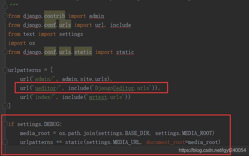6,在项目的url.py里面加入应用的路径和图片的上传的路径,如图中的红框: