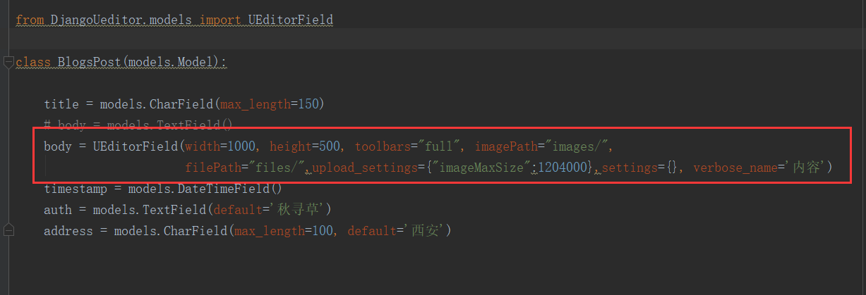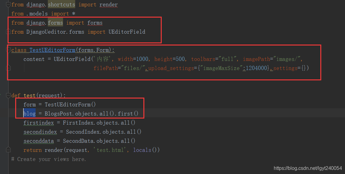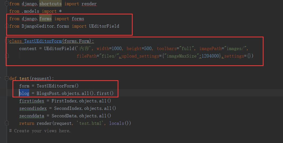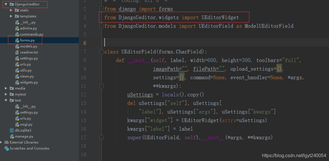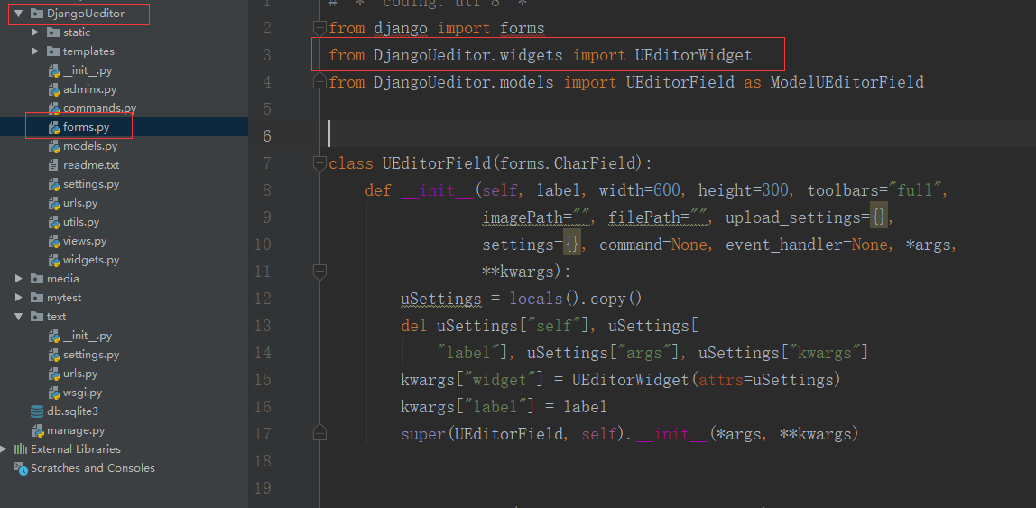 7,到DjangoUeditor应用下 的form.py,修改引入方式,不然会报错,修改成如下红框
