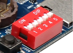 SW2设有5位启动选择开关,如下图方向放置,开关向上拨动为1,向下拨动为0,详情如下图所示: