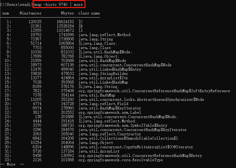 - jmap -histo 9740 | more : 查看堆中对象统计信息,包括类、实例数量,合计容量等。