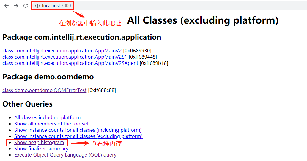 执行完后,程序堆内存溢出,此时在桌面生成了一个内存分析文件,使用jhat命令,可生成一个链接地址,如图: