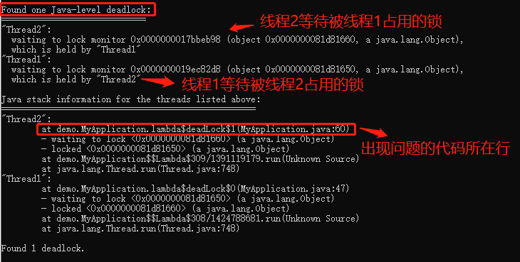 往下翻,在线程堆栈信息中,我们可以看到打印的死锁信息,如图: