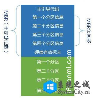 MBR的意思是“主引导记录”,最早在1983年在IBM PC DOS 2.0中提出。之所以叫“主引导记录”,是因为它是存在于驱动器开始部分的一个特殊的启动扇区。这个扇区包含了驱动器的分区信息(64个字节,大小固定,一个分区用16个字节记录)和已安装的操作系统的启动加载器(446字节)和2个字节的结束标志,所以这个扇区的大小是512个字节。。所谓启动加载器,是一小段代码,用于加载驱动器上其他分区上更大的加载器。如果你安装了Windows,Windows启动加载器的初始信息就放在这个区域里——如果MBR的信息被覆盖导致Windows不能启动,你就需要使用Windows的MBR修复功能来使其恢复正常。如果你安装了Linux,则位于MBR里的通常会是GRUB加载器。MBR支持最大2TB磁盘,它无法处理大于2TB容量的磁盘。MBR还只支持最多4个主分区——如果你想要更多分区,你需要创建所谓“扩展分区”,并在其中创建逻辑分区。MBR已经成为磁盘分区和启动的工业标准。