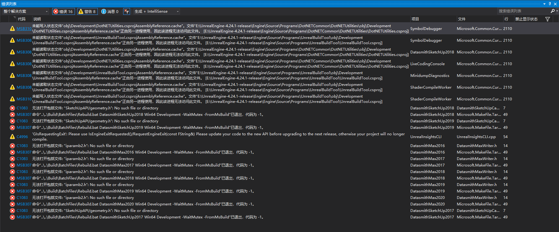 Datasmith导致的报错,可以点击选中Datasmith,右键卸载项目,再次编译即可(当然如果项目需要用到DataSmith,这里就不可以卸载)