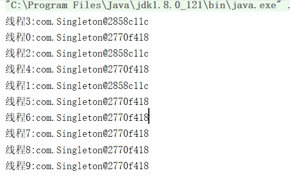 上面的代码很好理解,我们创建了10个线程,每个线程在运行时会打印出获取到的Singleton对象,那么会有怎么样的结果呢?