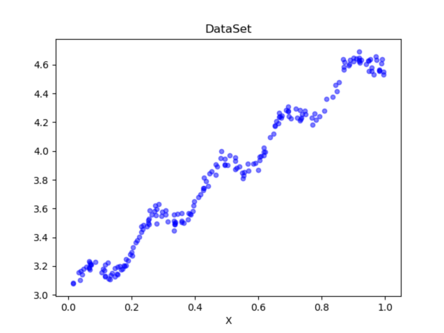 axs[0].scatter(xMat[:,1].flatten().A[0], yMat.flatten().A[0], s = 20, c = 'blue', alpha = .5) #绘制样本点