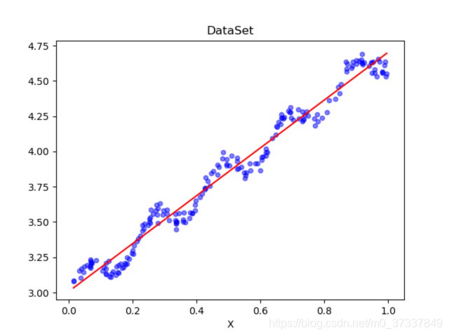通过可视化数据,我们可以看到数据的分布情况。接下来,让我们根据上文中推导的回归系数计算方法,求出回归系数向量,并根据回归系数向量绘制回归曲线,编写代码如下: