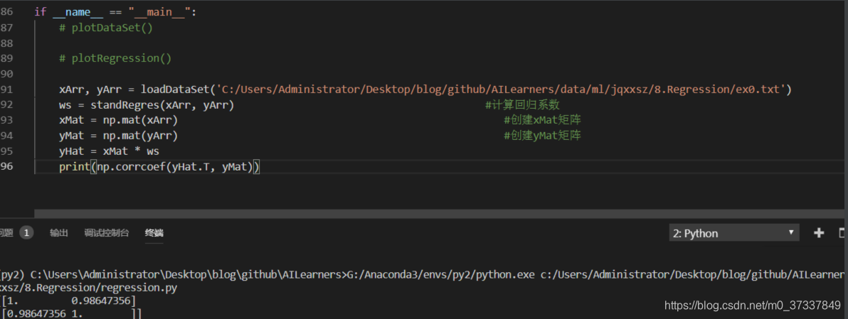 可以看到,对角线上的数据是1.0,因为yMat和自己的匹配是完美的,而YHat和yMat的相关系数为0.98。