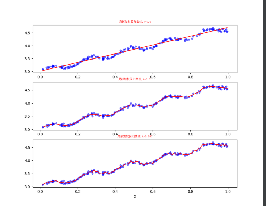 这样我们就可以根据上述公式,编写局部加权线性回归,我们通过改变k的值,可以调节回归效果,编写代码如下: