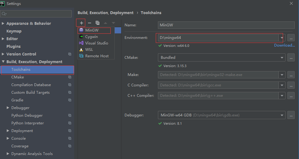 在enviorment那里填上刚刚安装的mingw64的路径,下面的选项它会自己检查,等所有的都出现√时,点击右下角的apply与ok,保存退出。