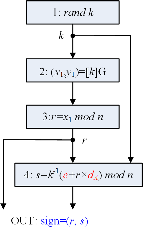- 签名者用户A的私钥dA(A的密钥对包括其私钥dA和公钥PA=[dA]G= (xA,yA))