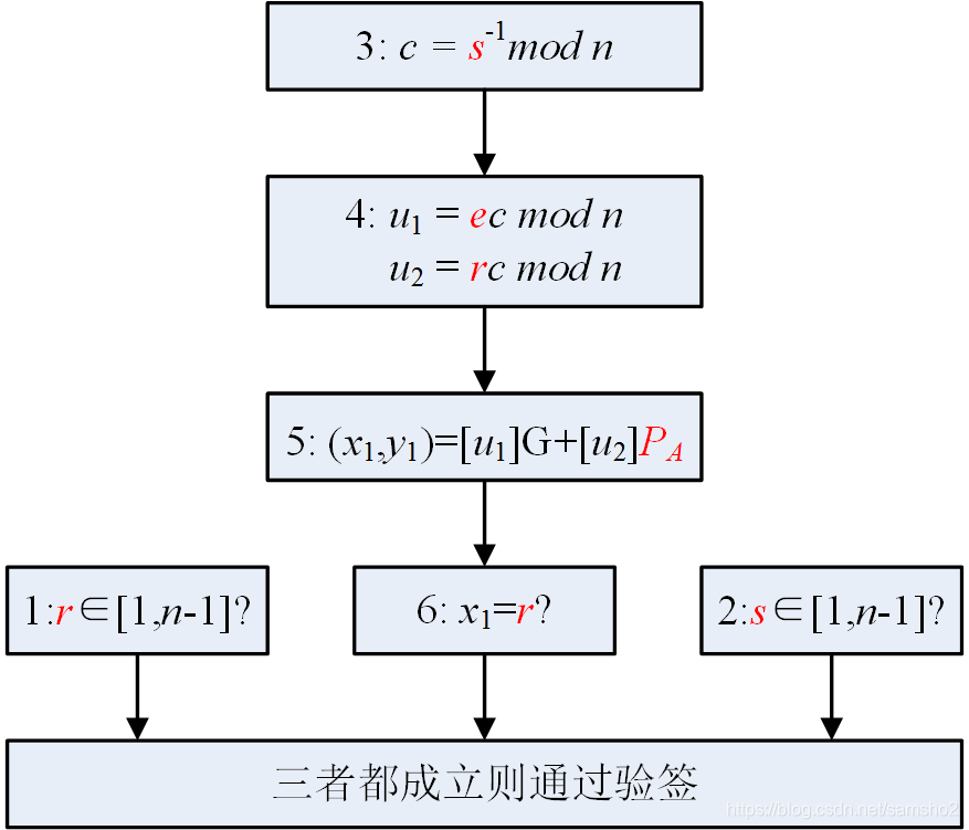 验证流程5计算的点(x1; y1) 和签名步骤2计算的点( x1, y1 )相等。
