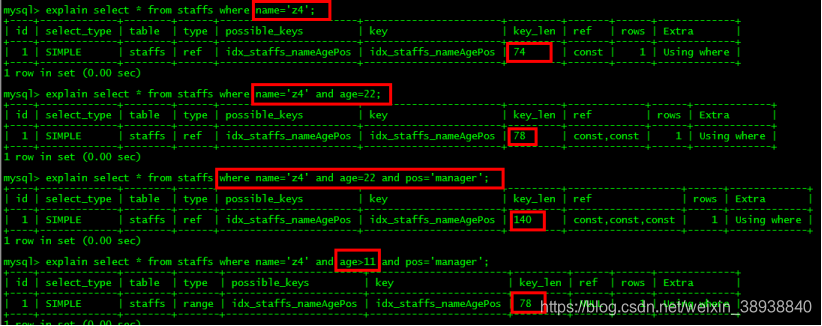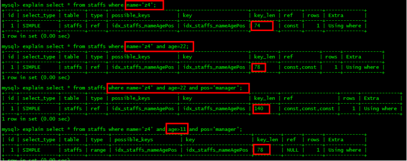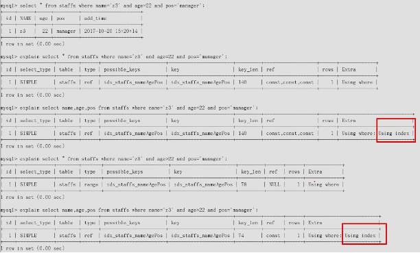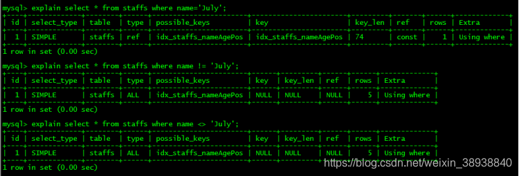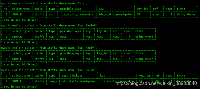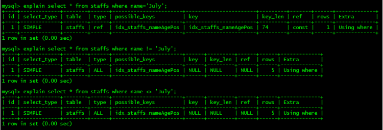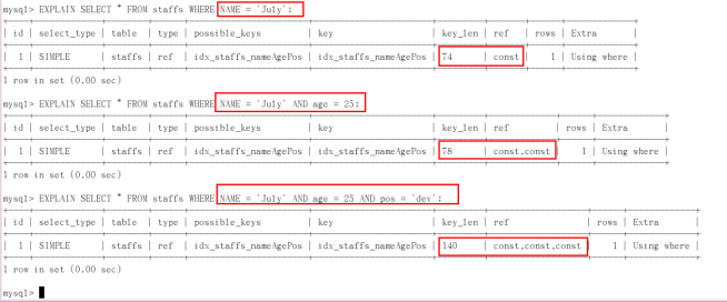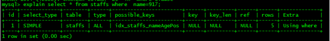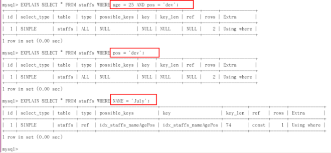 EXPLAIN SELECT * FROM staffs WHERE NAME = 'July' AND age = 25 AND pos = 'dev';