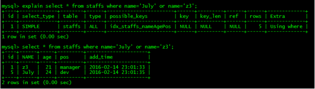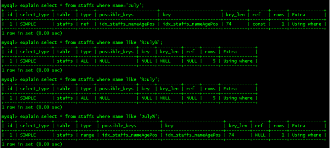 EXPLAIN SELECT * FROM staffs WHERE NAME = 'July' AND age = 25;