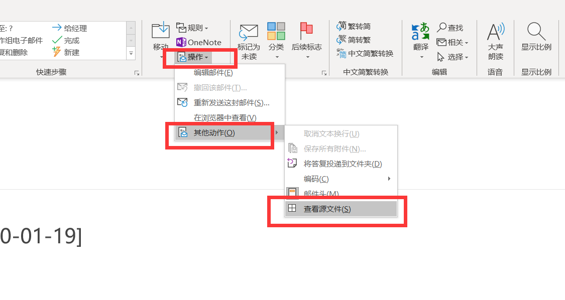 1. 双击点开邮件页面; 2. 单击 操作 -> 其他动作 -> 查看源文件 来源:CSDN作者:Inman_CAT链接:https://blog.csdn.net/yanglangdan/article/details/104053579 标签 邮件