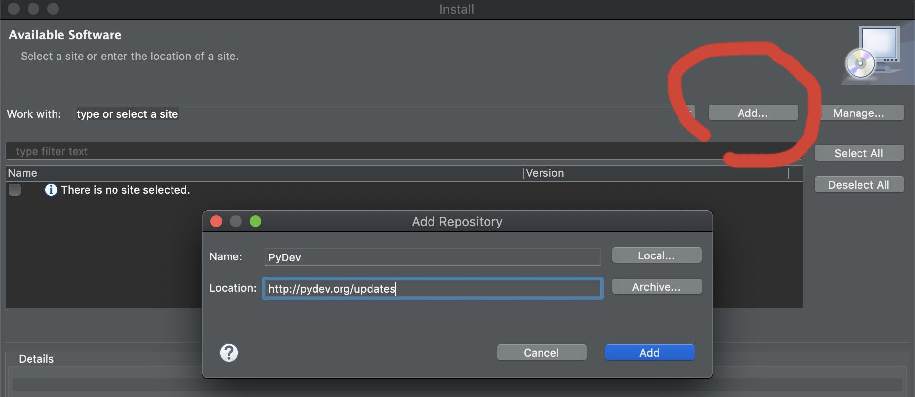 点击add,name自定义,location输入http://pydev.org/updates,点击add