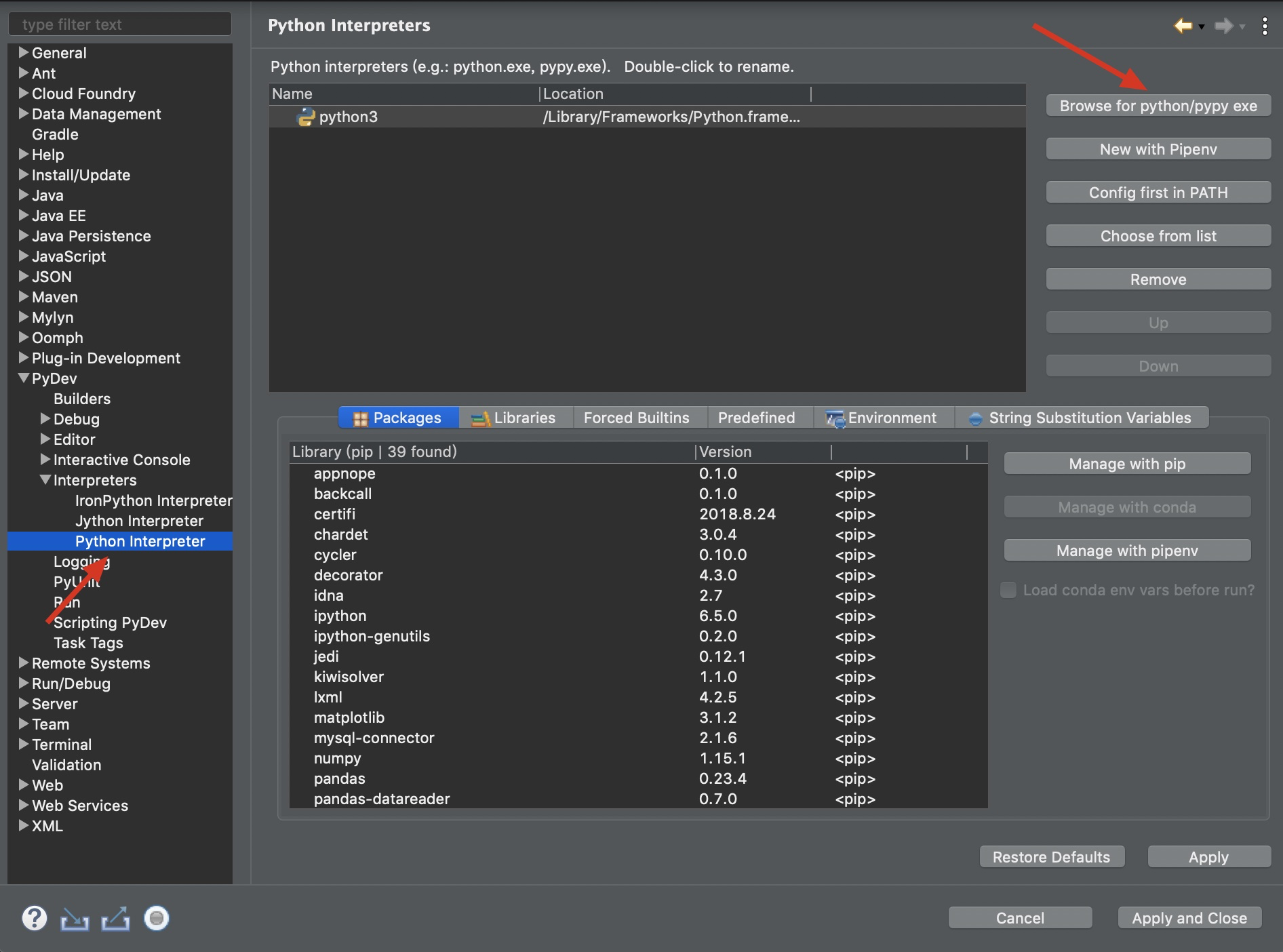 找到eclipse——preferences—— PyDev——Interpreters——Python Interpreter,点击右上角的Browse for python/python.exe