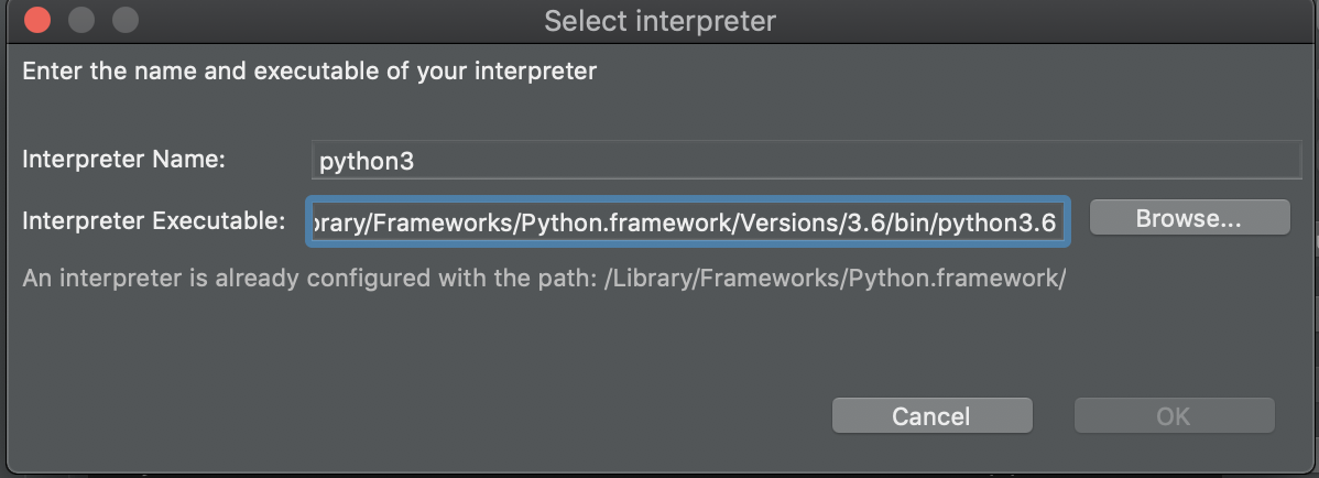 注意mac下的python安装目录默认为:/Library/Frameworks/Python.framework/Versions,进入该目录下选择自己所要添加的python
