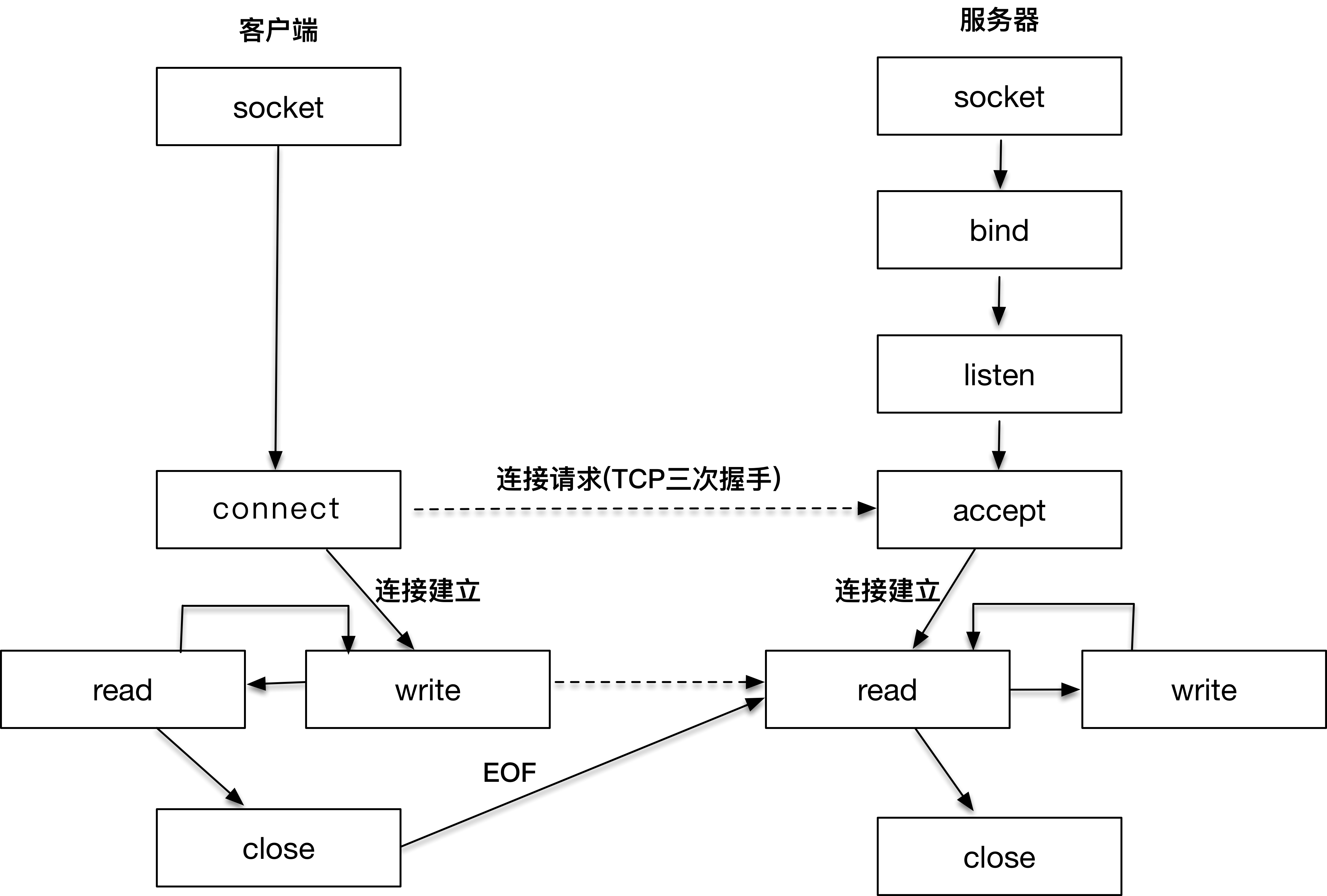 这张图是网络编程中,客户端和服务端工作的核心逻辑。先从右侧服务端开始看,因为在客户端发起连接请求之前,服务端必须先初始化好。首先初始化socket,之后服务器执行 bind() 绑定,将自己的服务能力绑定在一个众所周知的地址和端口上。紧接着,执行 listen() ,将原先的 socket转化为服务端的socket,服务端最后阻塞在 accept() 等待客户端请求的到来。