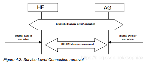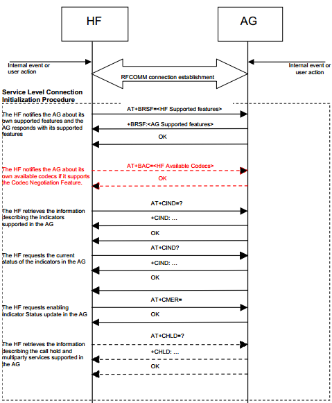 AG和HF均可以通过内部或者用户事件发起Service Level连接建立。Service Level Connection建立的前提是RFCOMM已经建立。同样RFCOMM的建立发起者可以是AG或者HF。