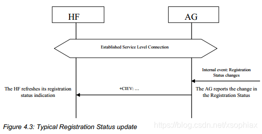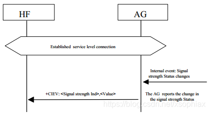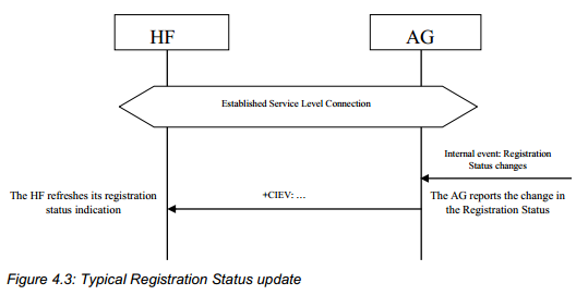 当HF取得AG的indicator后,HF会使用AT+CMER使能AG的indicator状态跟新功能,AG会返回OK作为应答。当service,call或者call建立状态发生时,AG将发送和indicator相关的+CIEV结果码给HF。HF根据收到的+CIEV码来跟新其自身内部的indicator。