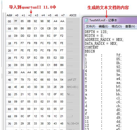 验证生成的数据是否正确:用记事本打开生成的mif文件,同时用Quartus打开mif文件,内容如下: