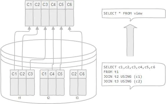 数据库视图的创建是基于SQL SELECT query和JOIN的。视图和表很相似,它也包含行和列,所以可以直接对它进行查询操作。另外大多数的数据库同样允许进行UPADTE操作,但必须满足一定的条件。视图的数据结构如图: