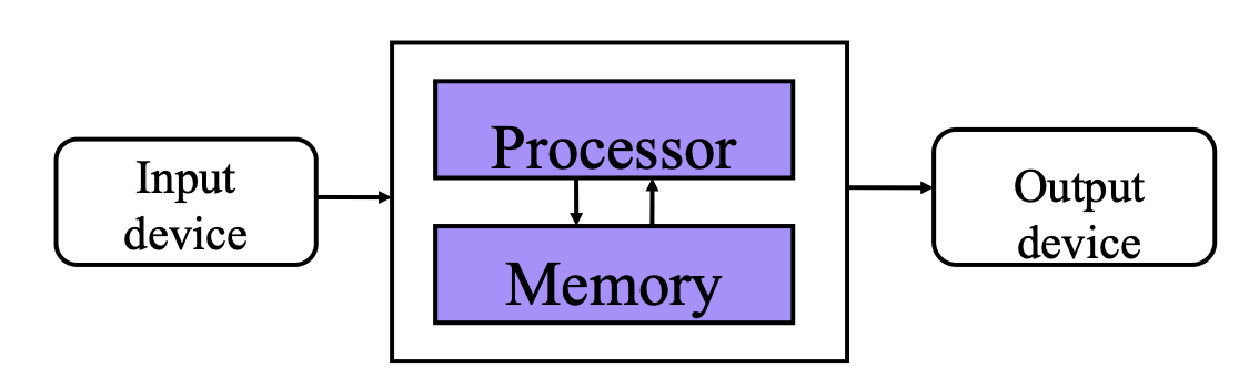 Components: CPU, main memory, secondary storage, input devices, output devices.