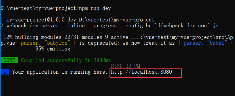 执行如下命令来启动创建成功的vue项目。