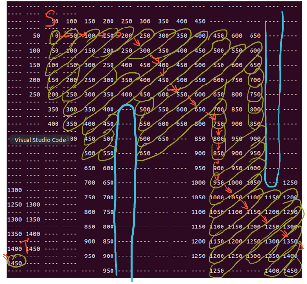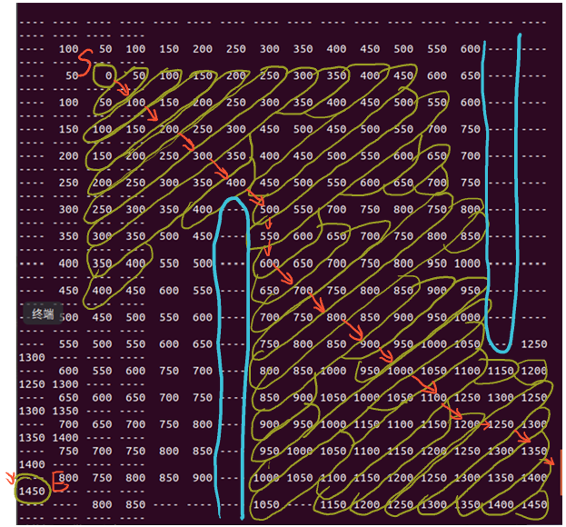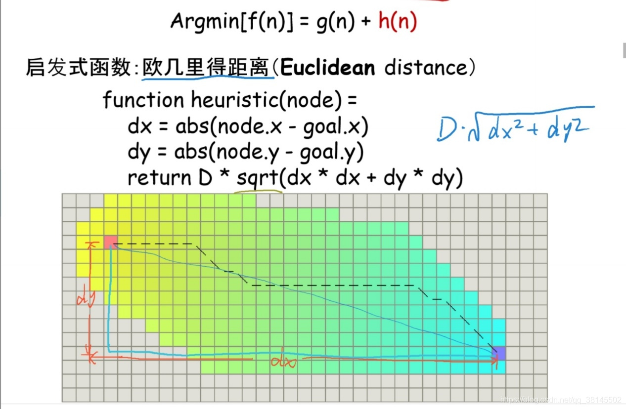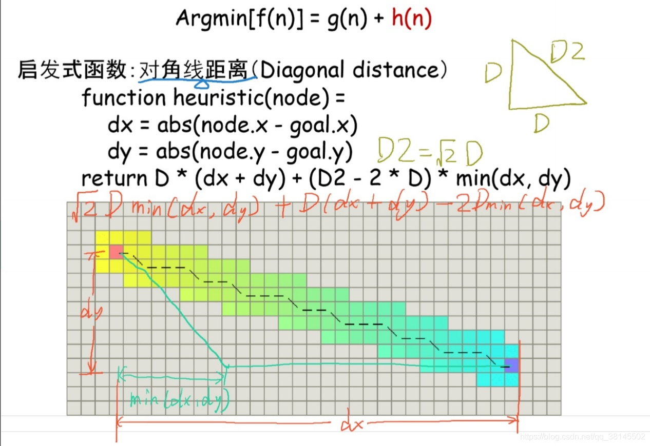 int distance = dx + dy + (1.4 - 2)*fmin(dx, dy); //当前点与目标点的对角线距离