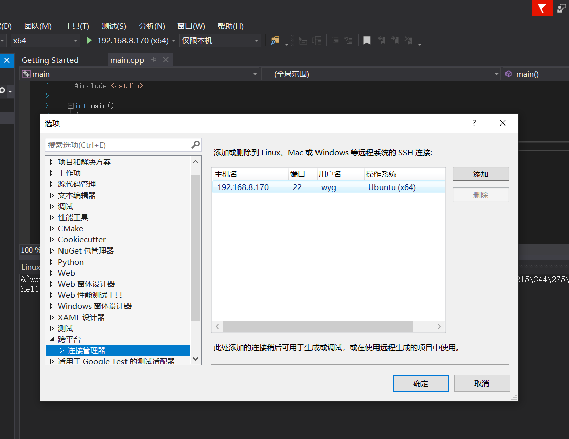 点击工具,选项设置连接管理器,连接到了我的ubuntu虚拟机的地址,并保存了用户名和密码