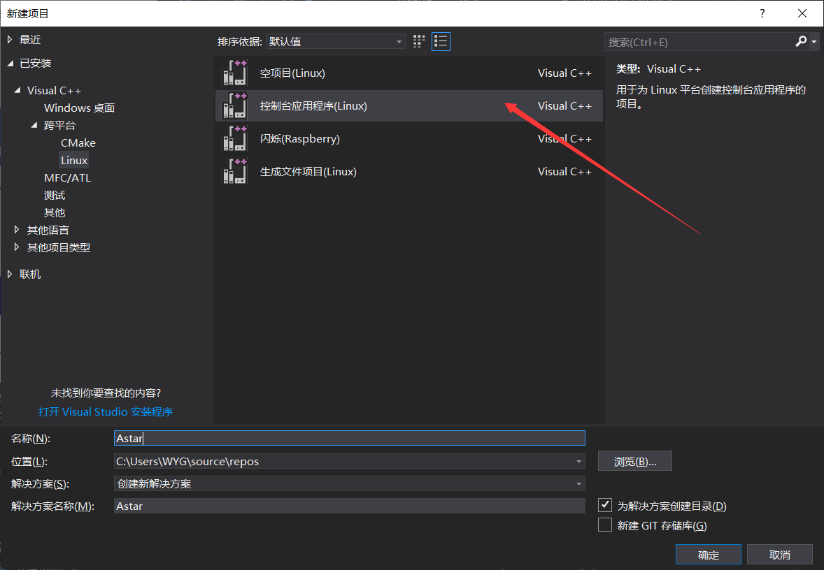注意选择跨平台Linux,因为源程序时VS下编译的,现在我们要去Linux编译所以要跨平台,在win下的可执行程序是.exe而在Linux下是.out或者没有。