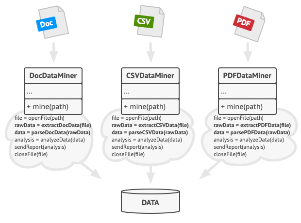 一段时间后, 你发现这三个类中包含许多相似代码。 尽管这些类处理不同数据格式的代码完全不同, 但数据处理和分析的代码却几乎完全一样。 如果能在保持算法结构完整的情况下去除重复代码, 这难道不是一件很棒的事情吗?