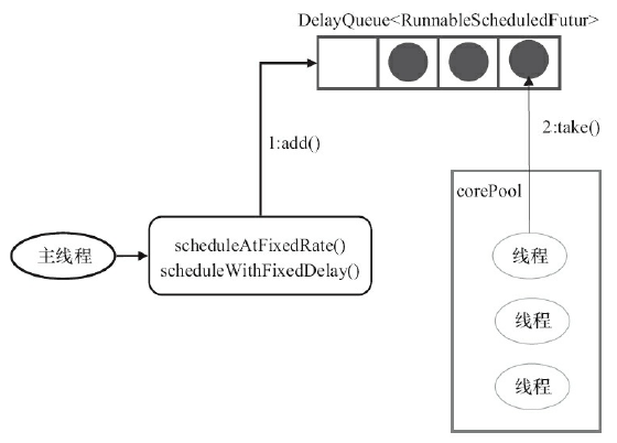 1)当调用Schedul edThreadPoolExecutor的schedul eAtFixedRate()方法或者schedule WithFixedDelay()方法时,会向ScheduledThreadPoolExecutor的DelayQueue添加一个实现了 RunnableScheduledFutur接口的ScheduledFuture Task。