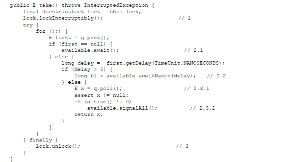 接下来,让我们看看上面的步骤1)获取任务的过程。下面是DelayQueue. take()方法的源代码实现。